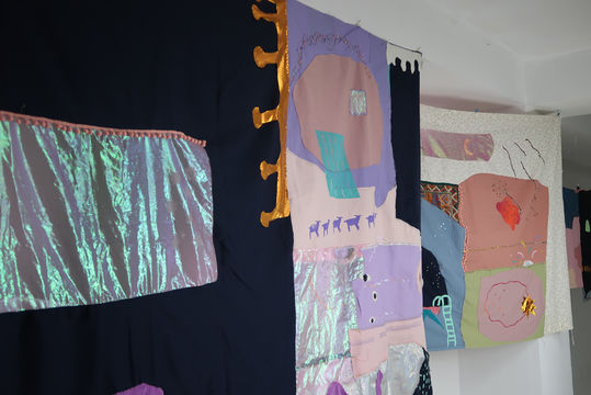 at the end of her stay. She had 3 week recidency at Kwiaciarnia Grafiki, working with fabric and screen print, with professional screen print technique, and present her work at Kwiaciarnia Grafiki’s gallery. Cindy Lien is mainly working with different types of fabrics used for handmade sawn pictures. Often the pieces are equipped with found objects.