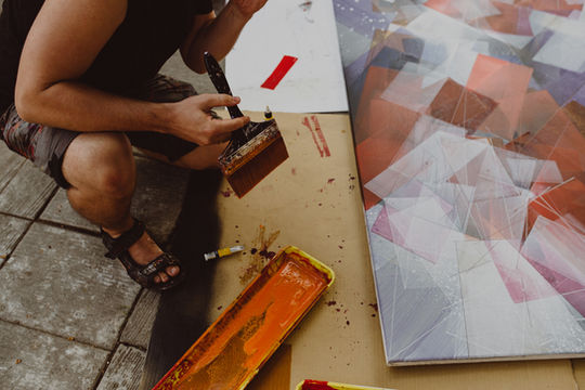 the live painting event. Passersby had the opportunity to enjoy the creative process of Bartek Świątecki while the artist turned a white canvas into a full geometrically overdosed, colorful, cyberpunk-inspired abstract paint. Being frequently asked by the many pedestrians that stroll the Cultural Center on a busy Sunday, Bartek could share his